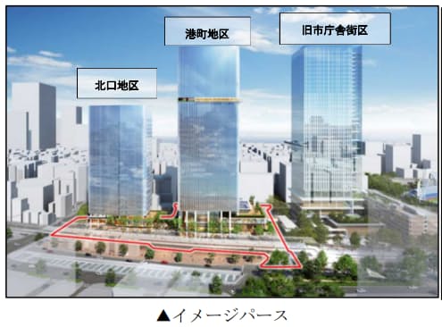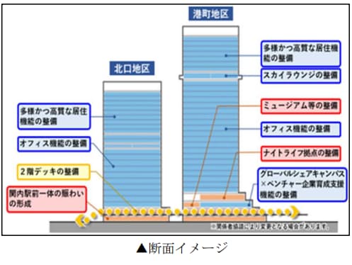規制緩和を受け、港町地区には地上32階地下2階、延べ床面積9万7000平方メートルのビル、北口地区には地上21階地下1階、延べ床面積3万3700平方メートルのビルを建設する。両ビルとも低層階は商業施設、中層階がオフィスなど業務施設、高層階は住居の計画だ。