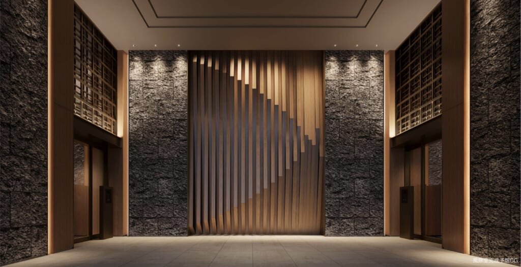 クラッシィタワーは縦に伸びる木調のファザードが特徴的で、重厚感を感じさせる外観となっています。