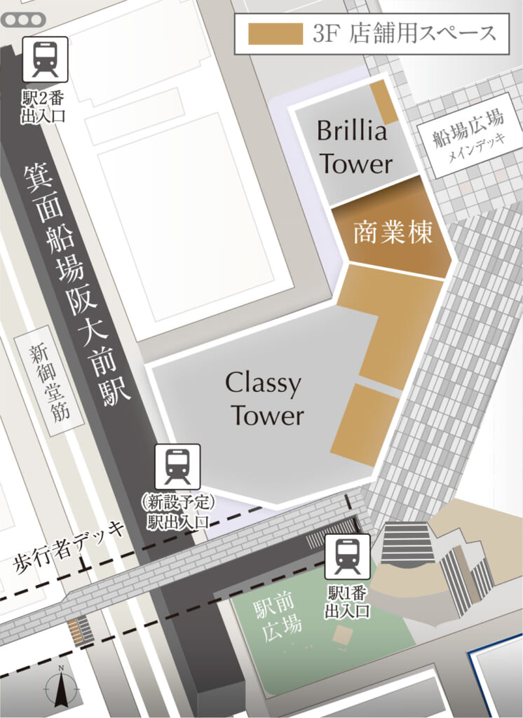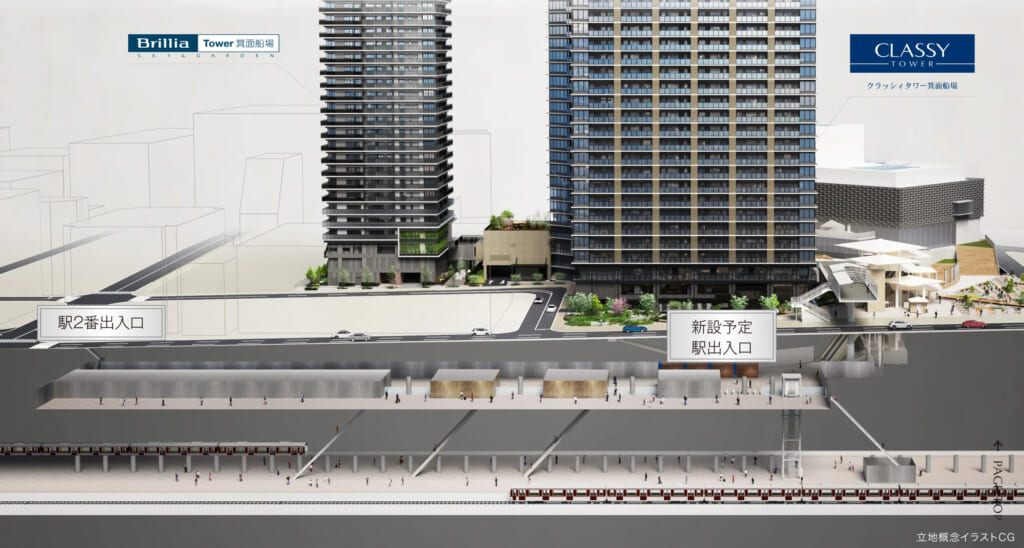 下の図の通り、クラッシィタワーは新設された駅出入口に直結しているのですが、ブリリアタワーは地上のデッキから、もしくは2番出口から2分と少し距離があります。