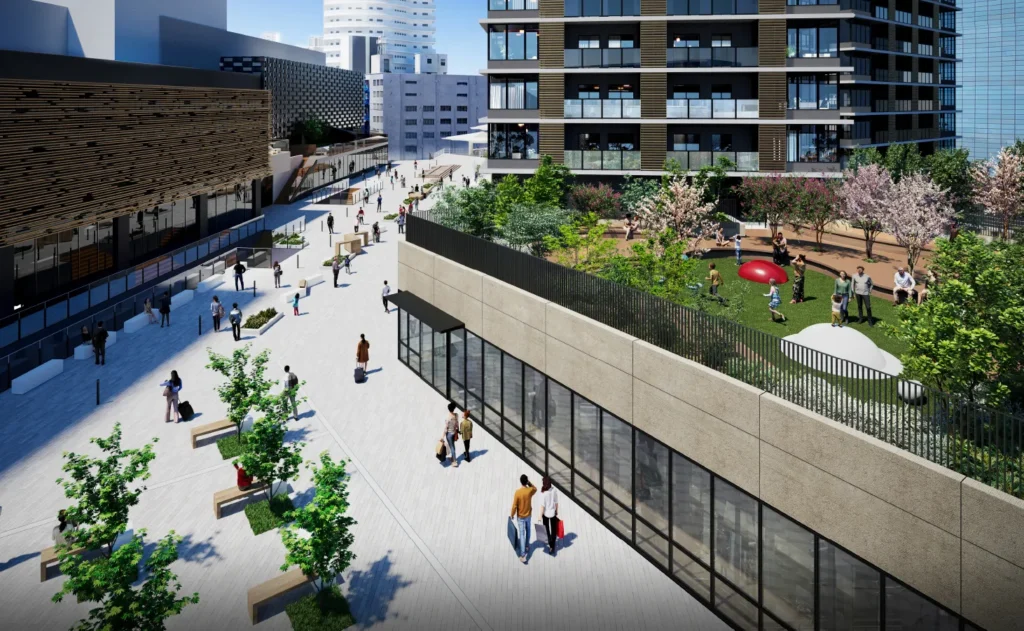 そして足元ですが、クラッシィタワーからブリリアタワーへ向かうデッキ部分に商業施設が2店舗入る予定となっており、その上に公園を設置します。