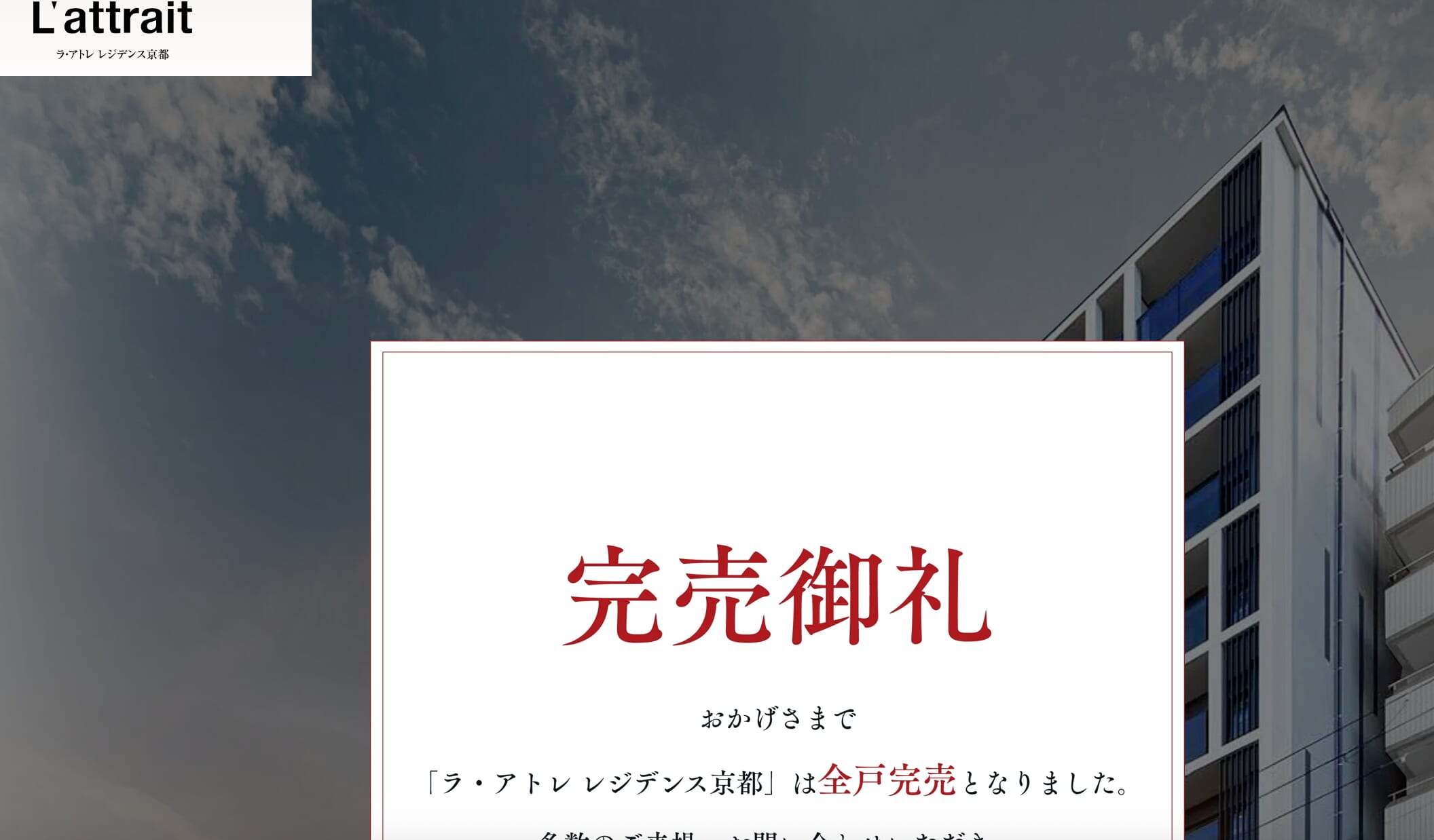『ラ・アトレレジデンス京都』全部屋が1LDKのため投資向けセカンド向けな感じでした。「堂々完成」の看板が残されていたためまだ販売中かと思われましたが