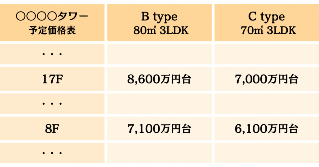 価格がどうなるかソワソワしていたのを覚えています意外と高いのではないか、高層階の方がいいかもしれないと気持ちが揺れている状態で価格表に目をやります