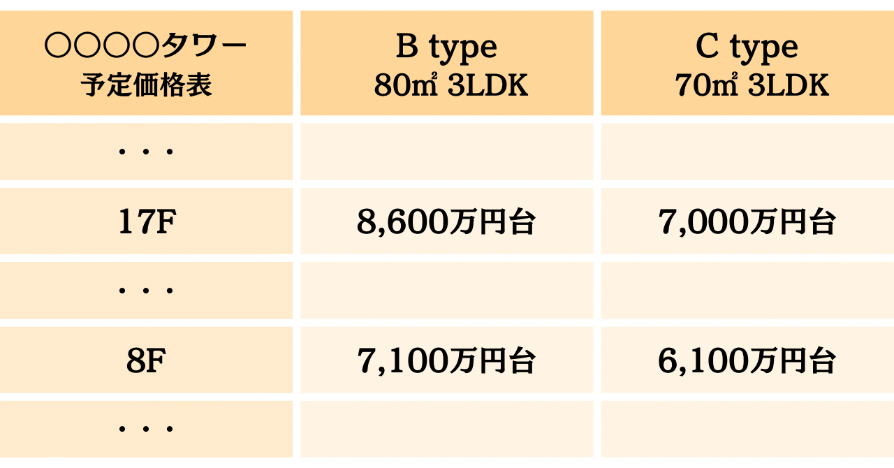 売主が提携している銀行の一角にテーブルが設けられ、物件の概要や販売スケジュールの説明と、高層階と低層階の代表的な階の価格を提示されました
