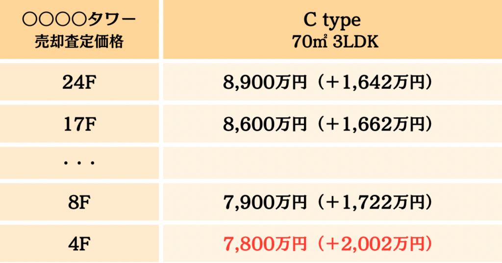私が購入した4階の含み益がもっとも大きい結果となり、自分の選択は正しかったと自己満足しています