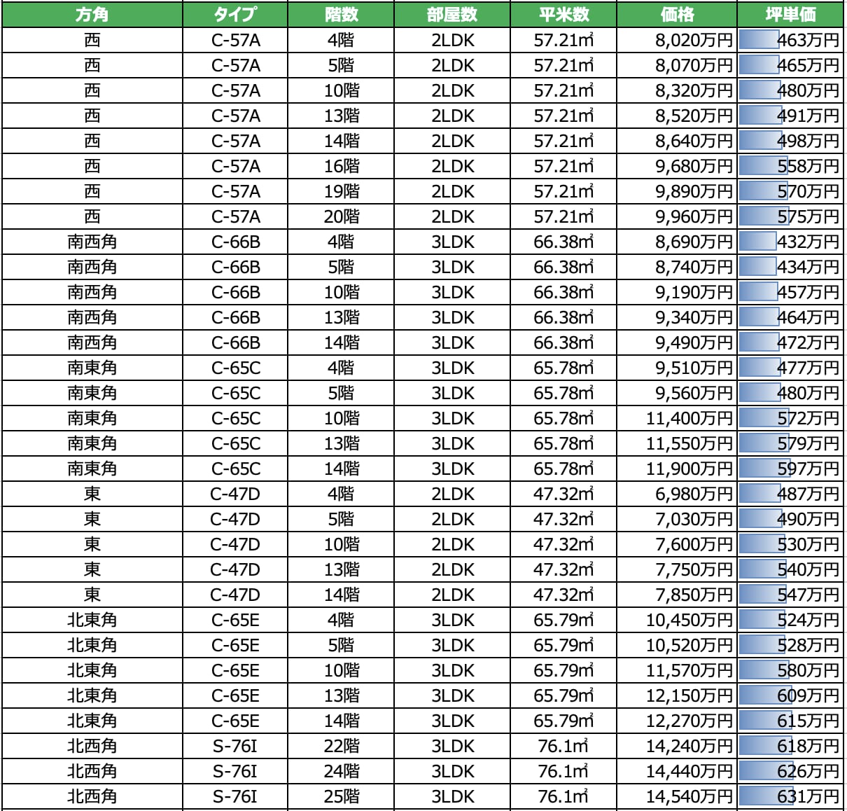 眺望が抜けやすい北東角・南東角はやはりかなり単価は高くなっており、南東角14階65㎡11,900万円(坪597万円)、北東角14階65㎡で坪600万円前後となりますので、周辺の中古タワマンよりは高くなってきます。