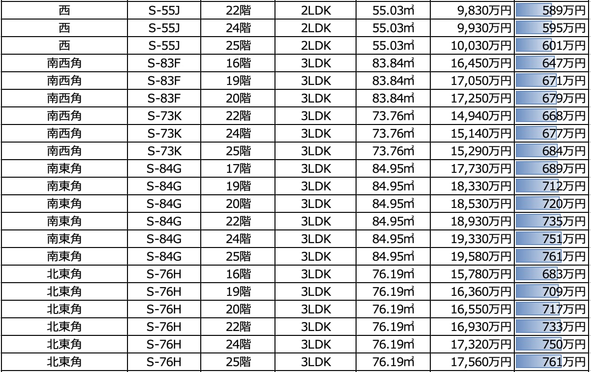 南側・西側にもマンションがあるため15階くらいまでは多少被ってきますが、南西角は非常に攻めた価格設定ですね!
