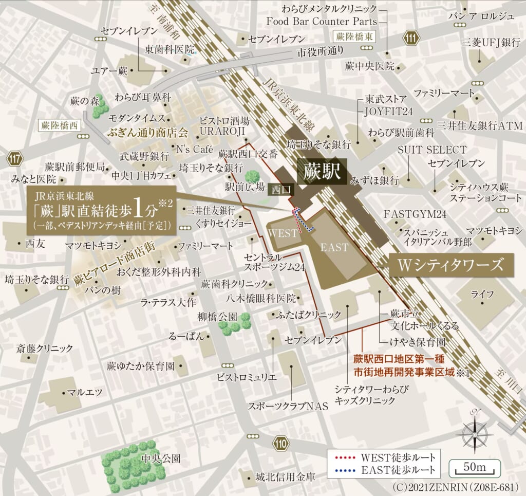 「蕨」駅直結徒歩1分(一部、ペデストリアンデッキ経由[予定])にツインタワーが現れる。
