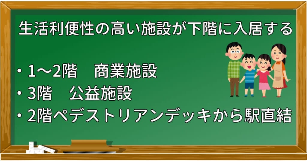 内廊下タワーマンション、駅前再開発、駅徒歩1分、下階に商業施設・公益施設、ペデストリアンデッキで駅直結