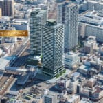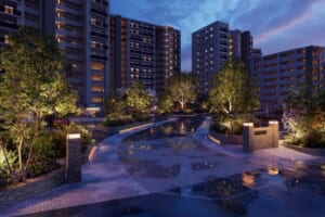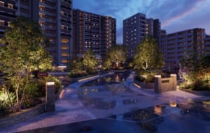 本物件の玄関、顔は北側になります。一般的に板状マンションの北側は廊下がくるのでカッコよくなりづらいですが、本物件は特殊な構造から外廊下と占有部の窓が混じる外観になっており、普通のマンションより凹凸感がありますね。また6棟の建物で階数が統一されておらず、A棟やF棟の高さが低いのでいわゆる「団地感」を感じにくいデザインになっています。ただ個人的には建物のデザインよりも植栽の方に期待してしまいます。福岡の街を歩いてるとき「このマンションの外構カッケー!」と思って建物を見るとだいたいエンクレストの賃貸なんですよね。そんなエンクレストのフラッグシップ分譲の庭がカッコよくないわけがないでしょう!とくに外構のライトアップは実物じゃないとカッコよさが伝わらないので完成が楽しみです。