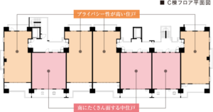 ちょっとした特徴ですが、最も戸数の多いC棟は少し変わった作りをしていて、角部屋でなくても南北どちらの方角にも掃き出し窓とバルコニーが設定されている部屋が用意されています。両方の窓を開ければ気持ちよく風が家の中を抜けるでしょう!