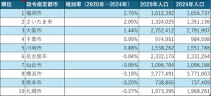 下の表は2020年の国勢調査データと2024年の推計人口データからこの期間の政令指定都市の人口増加率をランキング化したものです。福岡市は全国の政令指定都市で最も人口増加率の高い都市です。