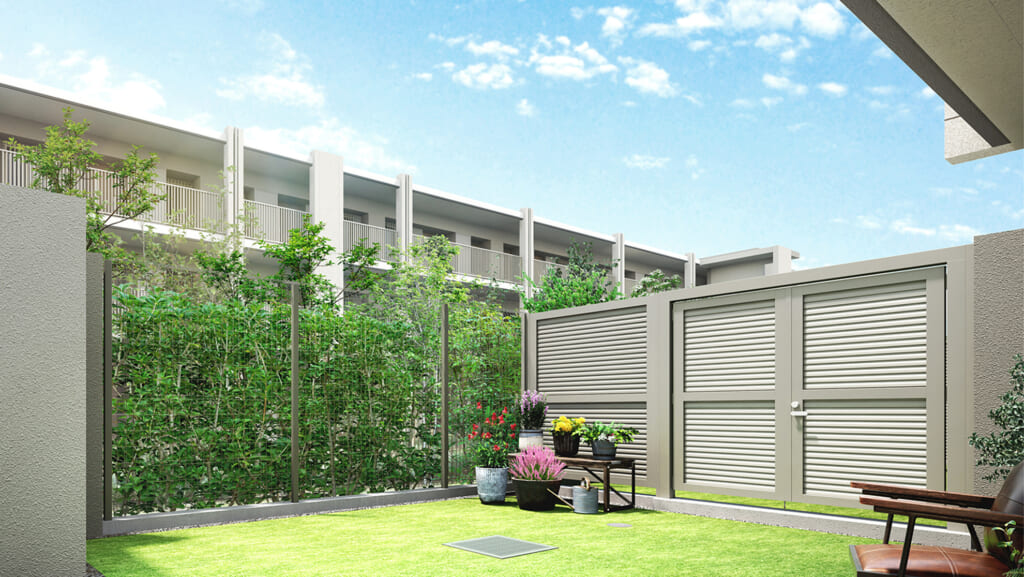 そして、1階住戸には全て専用庭があります。人工芝が敷かれていますね。