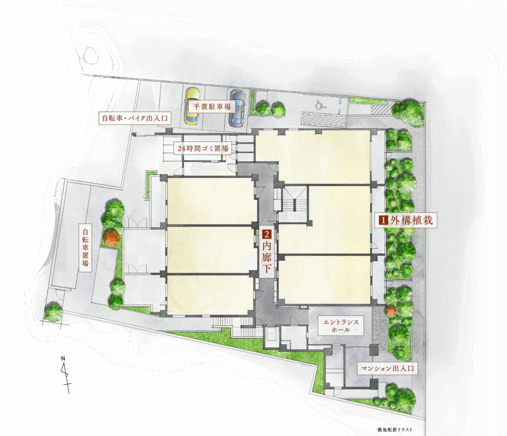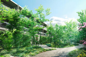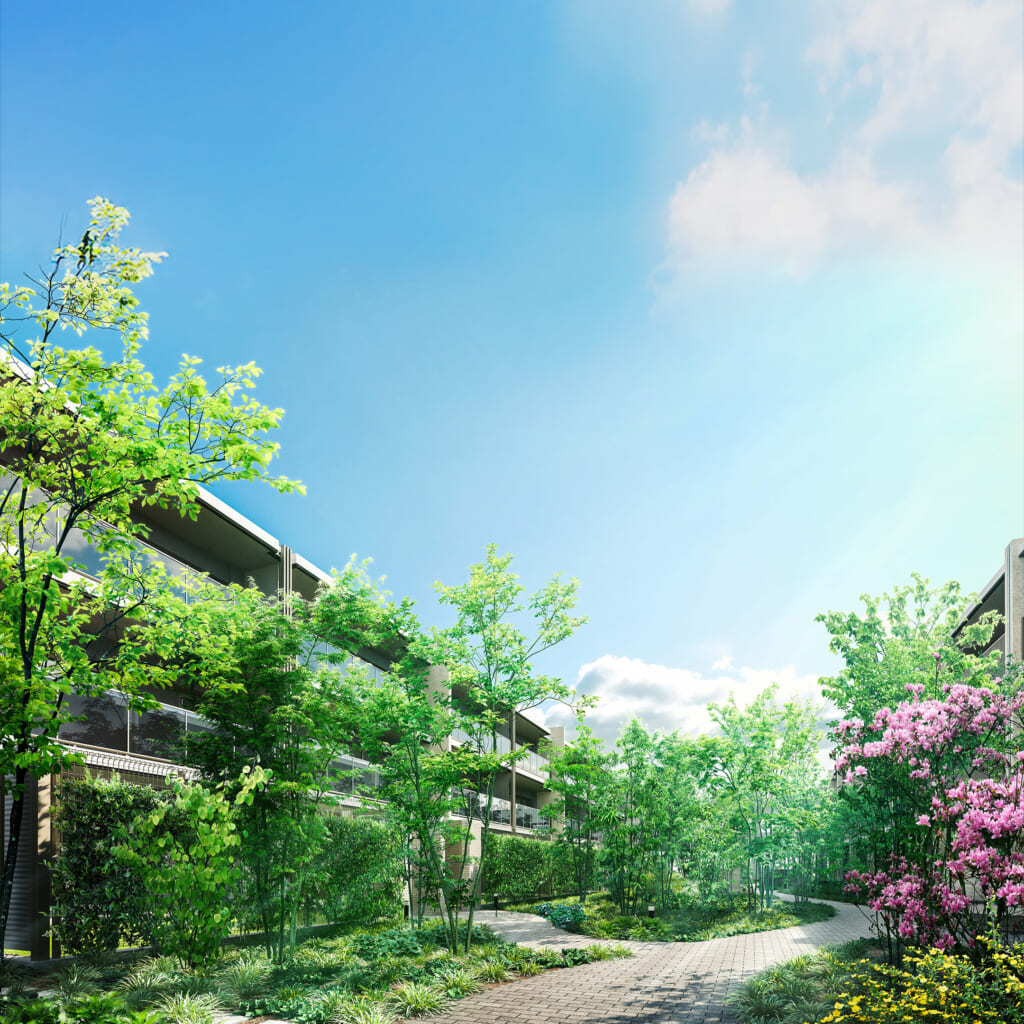 敷地中央に森の小路のような居住者専用のガーデンフォレストが設けられています。歩くのはもちろんですが、フォレストコート側の2階3階からこのような景色が見られるのも魅力的です。