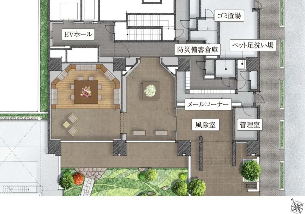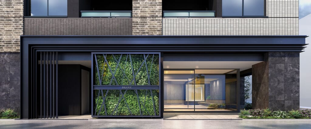 エントランスは不動前駅に一番近いところにあり、大通り沿いではないことからプライベート感ある佇まいを得られるレイアウトになっているのが高級感ありますね