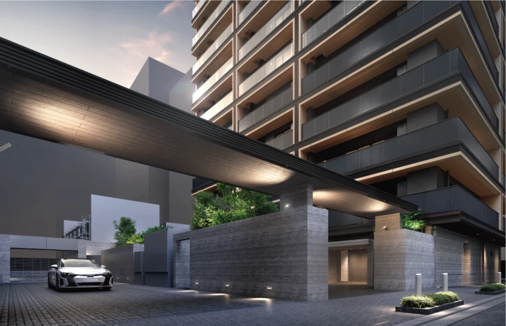 駐車場とエントランスの入り口の上には、大きなゲートがあり、存在感を醸し出します。実際ゲートがあるマンションは他にもありますが、断然あると建物の締まりが良くなり、高級感ある仕上がりになります。当マンションは特にゲート下をライトアップするようなので夜の見え方にも期待したいです。
