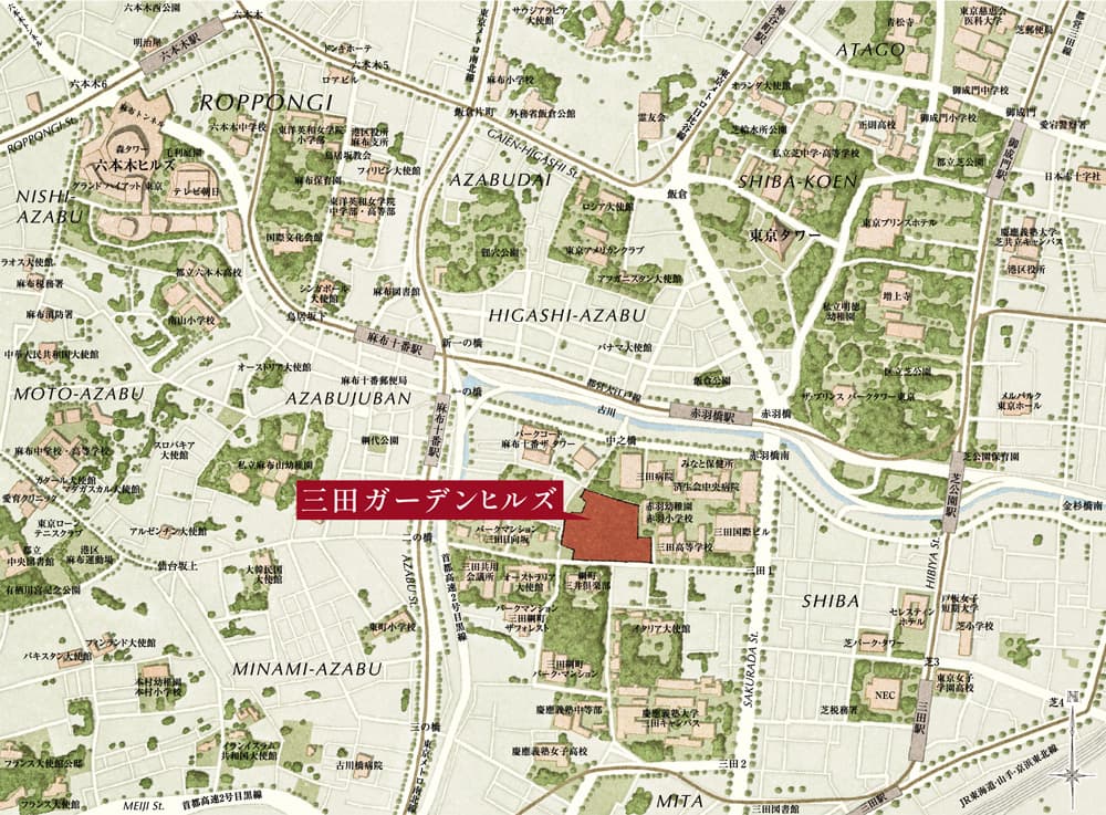 ノースエントランスから最寄り駅の「麻布十番」までは約徒歩5分、ほかにも「赤羽橋」駅、「芝公園」駅、「三田」駅なども徒歩圏内。20分弱歩けば山手線「田町」駅にも行ける立地です。
