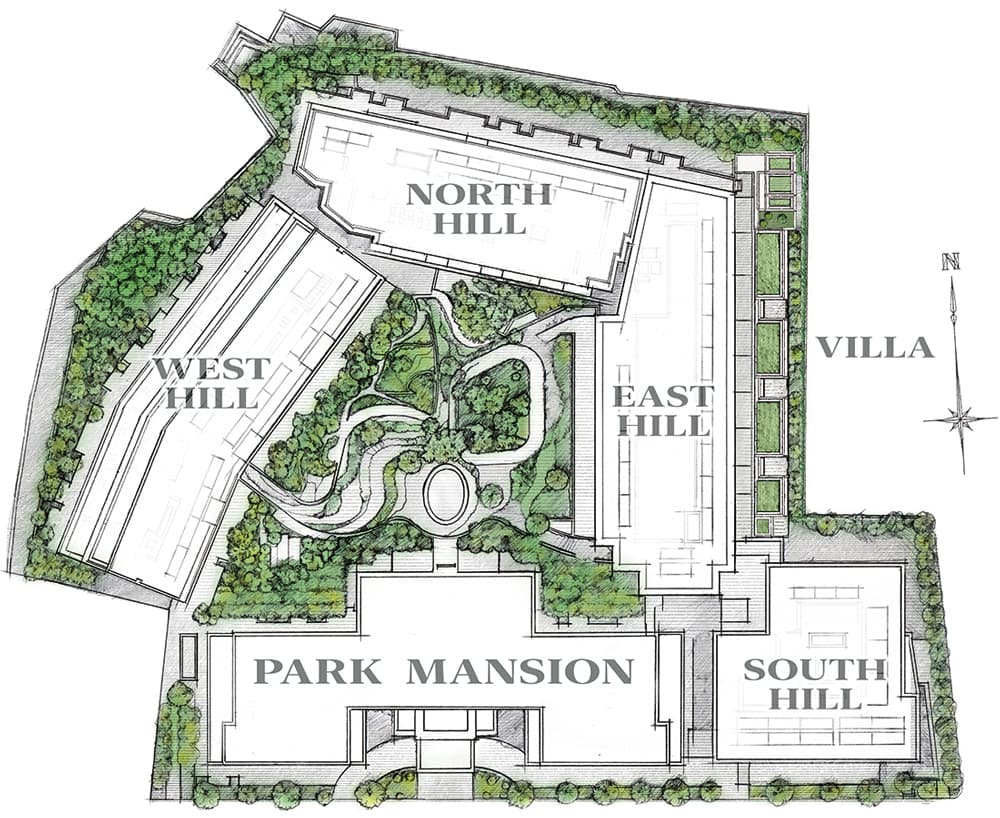 敷地の真ん中には中庭があり、パークマンション、ノースヒル、イーストヒル、ウエストヒルで中庭を囲む配棟になっています。