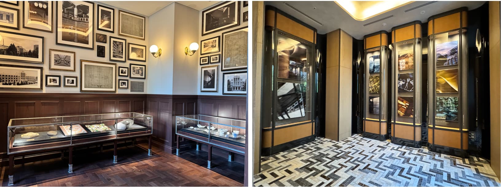 それぞれの棟に共用施設が配置されていますが、やはり特筆すべきは、パークマンションの共用施設(共用スペース)でしょう。グランドエントランスを入ると左右に小さなスペースがあります。一つはちょっとしたウエイティングスペース、もう一つはこの土地の歴史が展示されています。さながら博物館のよう。