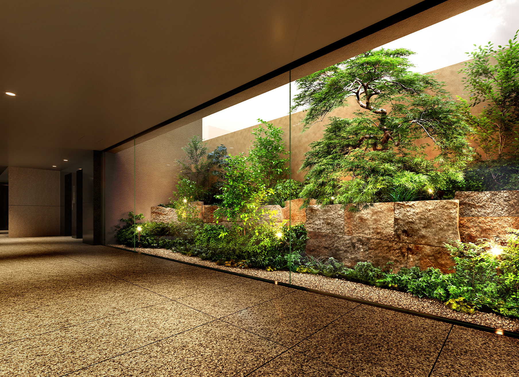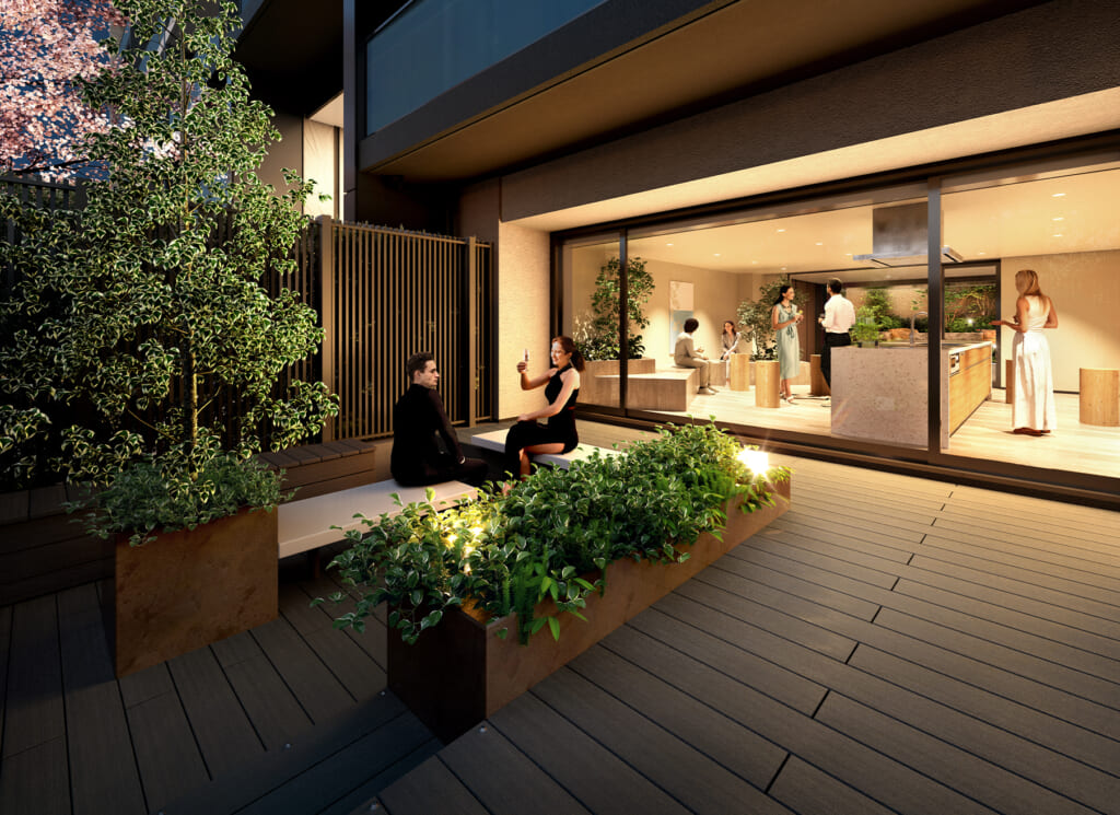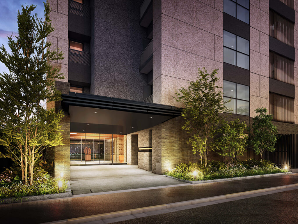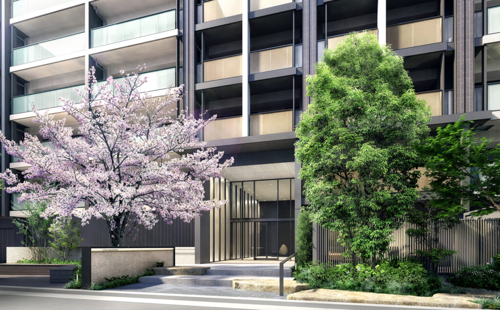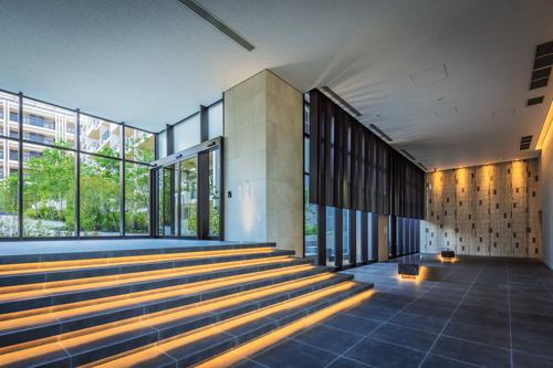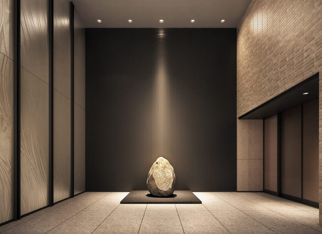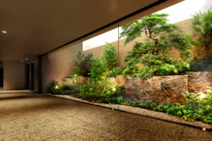 エントランスホールは2層吹き抜けの空間となっており、分譲マンションに住んでいるんだなというのを実感できると思います。エントランスホールを抜けた先には坪庭の緑が見えるということで、帰宅時にホッとする空間になりそうです。