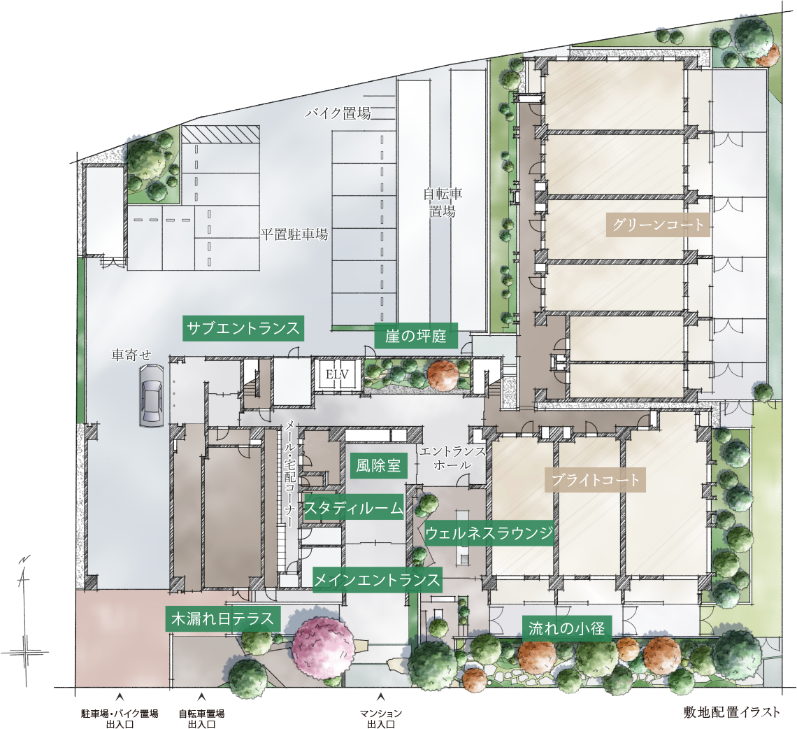 | 駐車場 | 平置駐車場12台(うち身障者用1台)(月額使用料:34,000円~38,000円) |