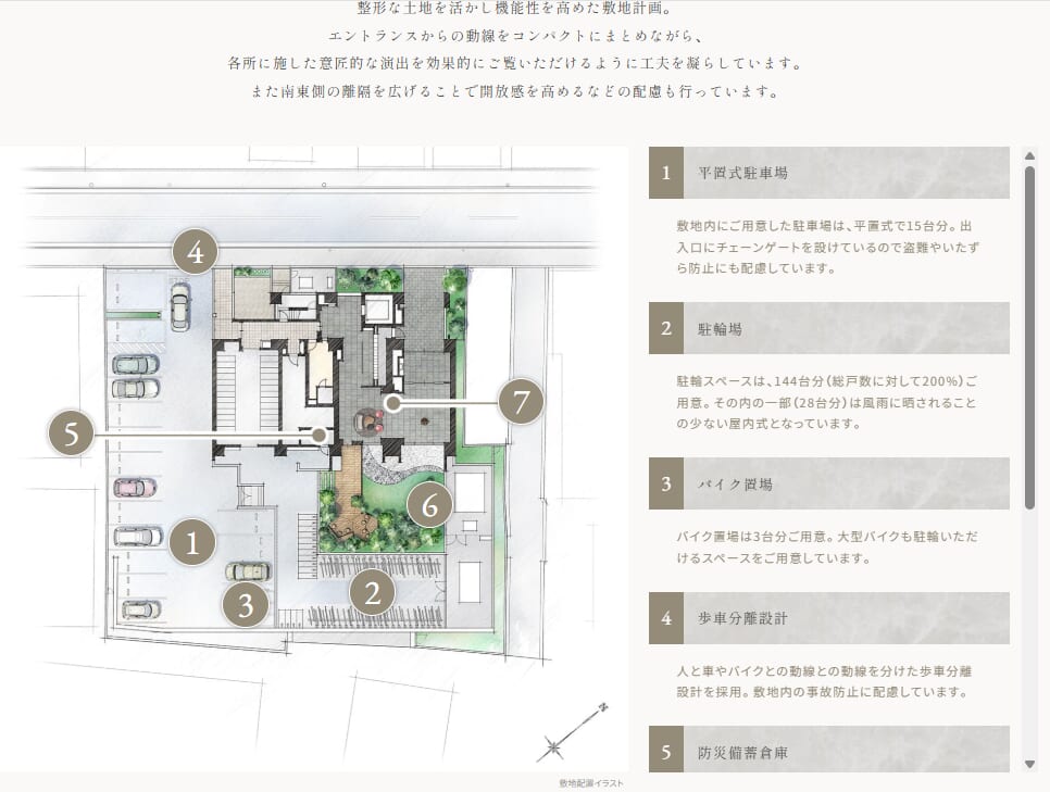 デザイン面以上にきになるのは、駐車場の少なさでしょうか。正面から見えない位置に駐車場があるので、そこはデザイン面でとても良いのですが、いかんせん台数が少ない。実際に現地に行くと車で向かうのが苦になりそうな道路ではあるので、積極的に車にやさしいマンションであるとは言えないのですが、付帯率が10%程度と言うのは残念です。