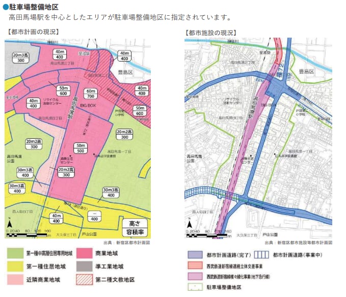 現状の都市計画ですと駅前の再開発エリアは高さが60mか50mの建物しか建ちませんが、ここをどう土地利用計画を変更して再開発が出来ないかが、デベロッパーの腕の見せ所ですね。再開発エリアに隣接する戸塚第二小学校もかなり古めであり、併せて改築が進むと小学校隣接の住居になるので、こちらも併せて良くなるとよいですね(しかし、新宿区の設備計画によるとあと10年程度は、現状の建物を使用するようです。
