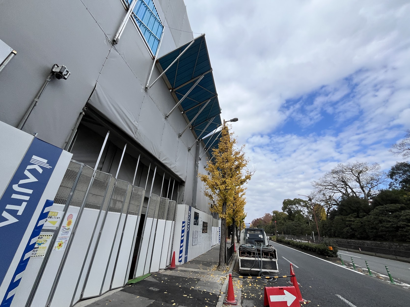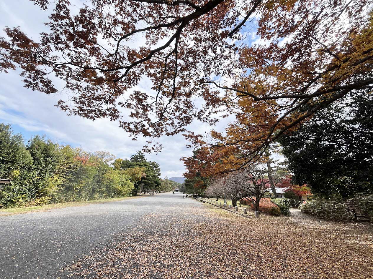 枯葉舞い散る秋の京都御苑の東側にバリケード