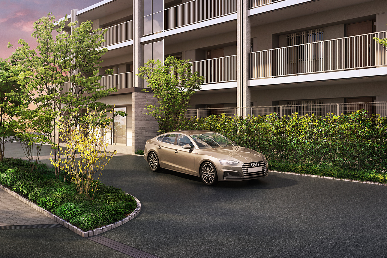 東西に横に伸びる2棟構成のマンションになっており、2棟の間をガーデンフォレストとして植栽を充実させています。これは雰囲気良いですね!セキュリティエリア内なので住民以外の人が入ってくることもないですし、フォレストコートの人はこの緑を借景にできるので眺望が抜けないネガをカバーしています。(こちらも廊下の手すりはガラスパネルだともっと高級感出て良かったのに…とは思います)
