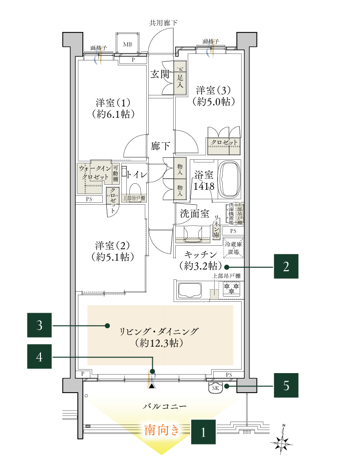 またリビング側だけでなく廊下側も柱が廊下に出ていることで全ての部屋がきれいな四角形になっています。特に廊下側の洋室は柱が食い込みがちでベッドなどの家具配置が難しいケースが多いので、この点もとても良いと思いました。