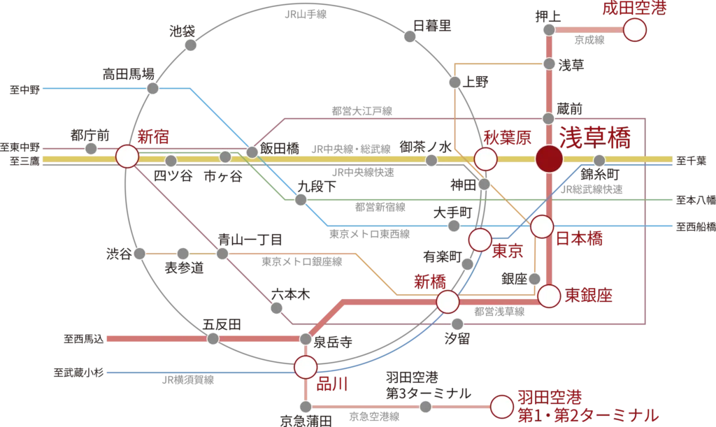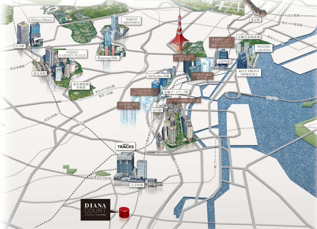キットキャットは都営浅草線のポテンシャルに注目しており、その沿線に誕生する本物件には大きな期待を寄せています。浅草線は、押上、日本橋、東銀座、新橋、大門、三田、泉岳寺、品川といった再開発エリアを一直線に結ぶ路線で、駅名を並べるだけでもワクワクするようなプロジェクトが目白押しです。