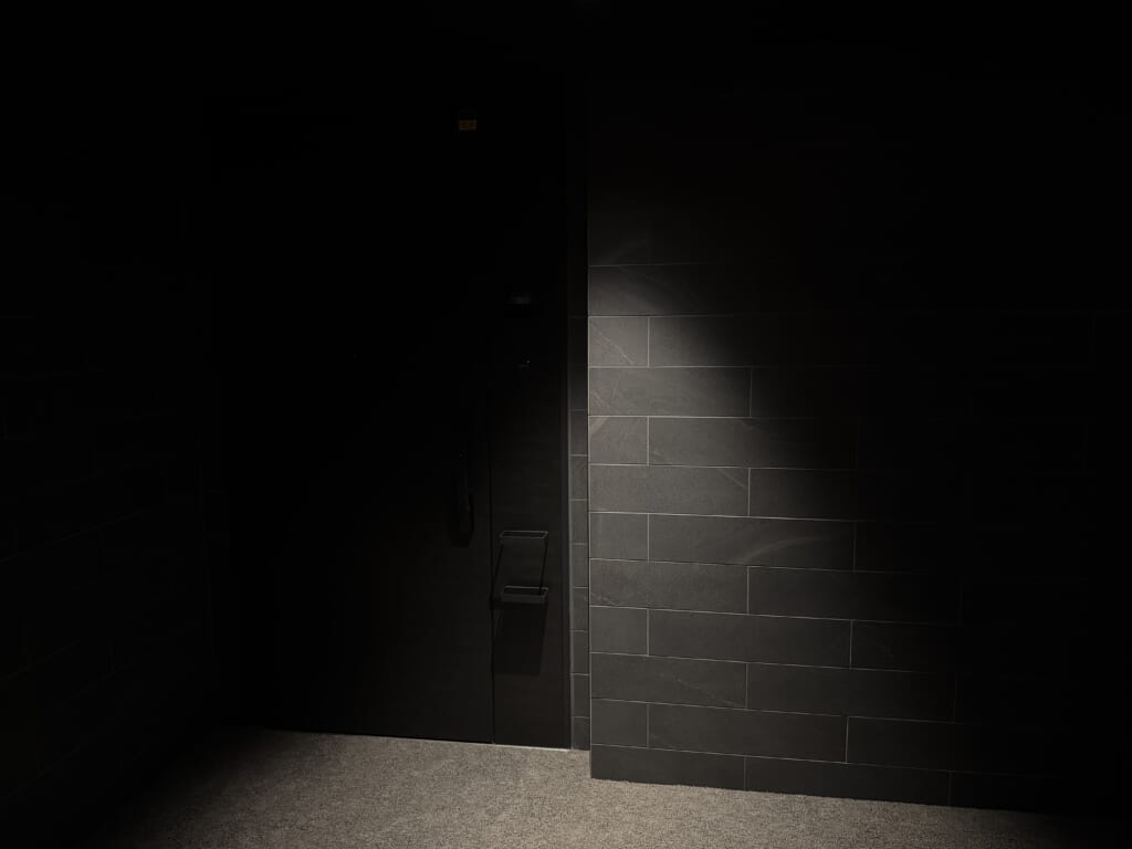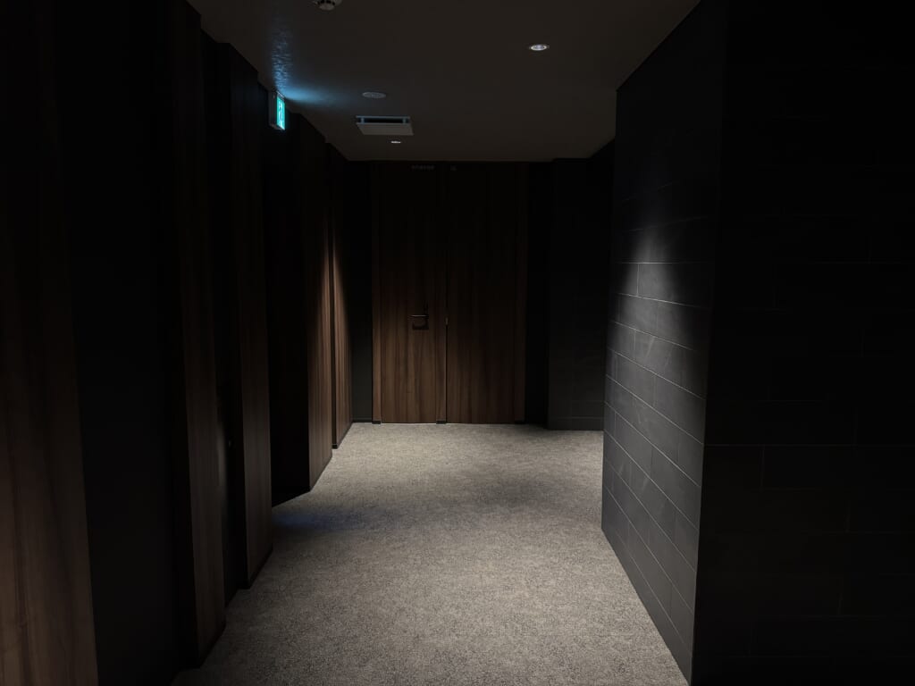 壁面タイルの色もあいまって、かなり暗めです。(個人的には暗めな内廊下好きです)