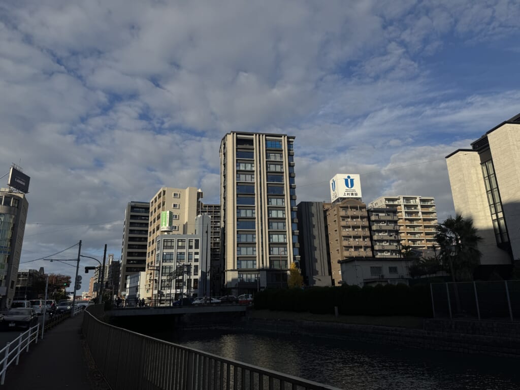 黒門川から本物件を撮影。写真真ん中に写るのがプレミスト大濠公園!