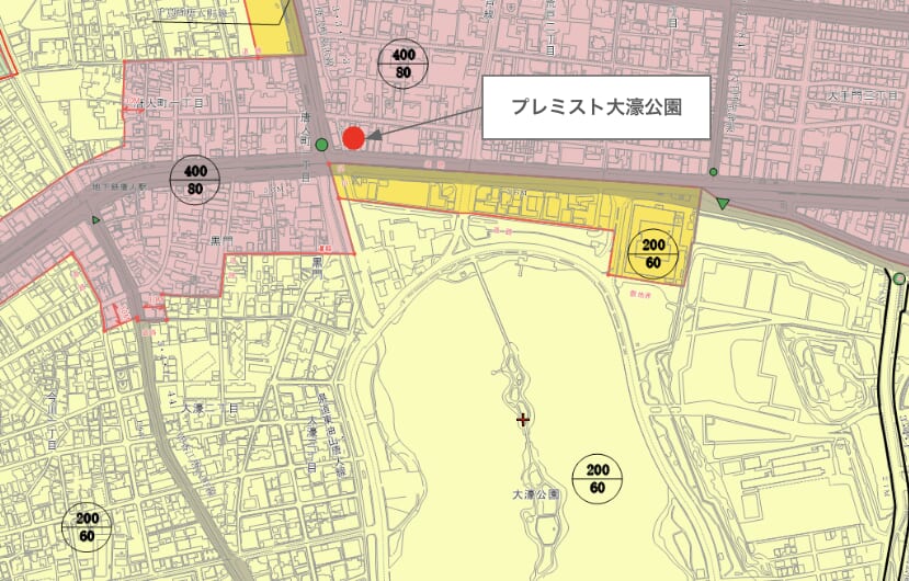 本物件は建蔽率・容積率緩和の境目に位置します。福岡市Webマップに筆者加筆