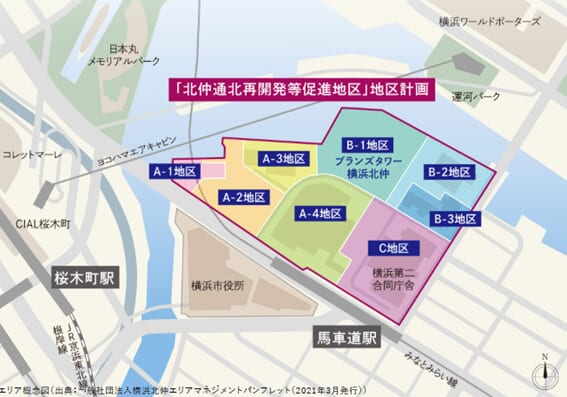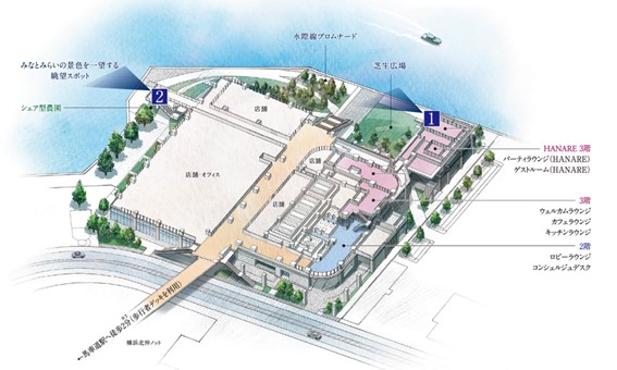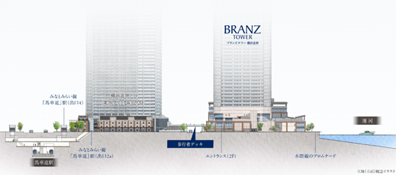 馬車道からデッキで接続され、徒歩2です。桜木町駅は徒歩9分となります。なお、馬車道駅までは「歩⾏者デッキを利⽤した徒歩分数であり、歩⾏者デッキの完成は遅れる可能性がある」旨の記載があります。