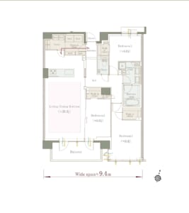 平均専有面積93㎡超と広い専有面積中心のプラン構成になっています。