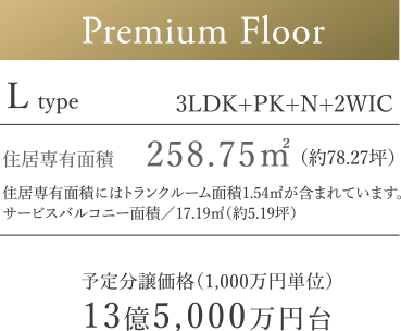 地下駐車場優先使用契約権付、LDの天井高約2800mm、オール二重床のプレミアムフロアは驚異の13億5000万円台(坪単価@1700万円台)