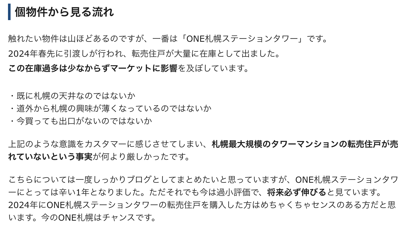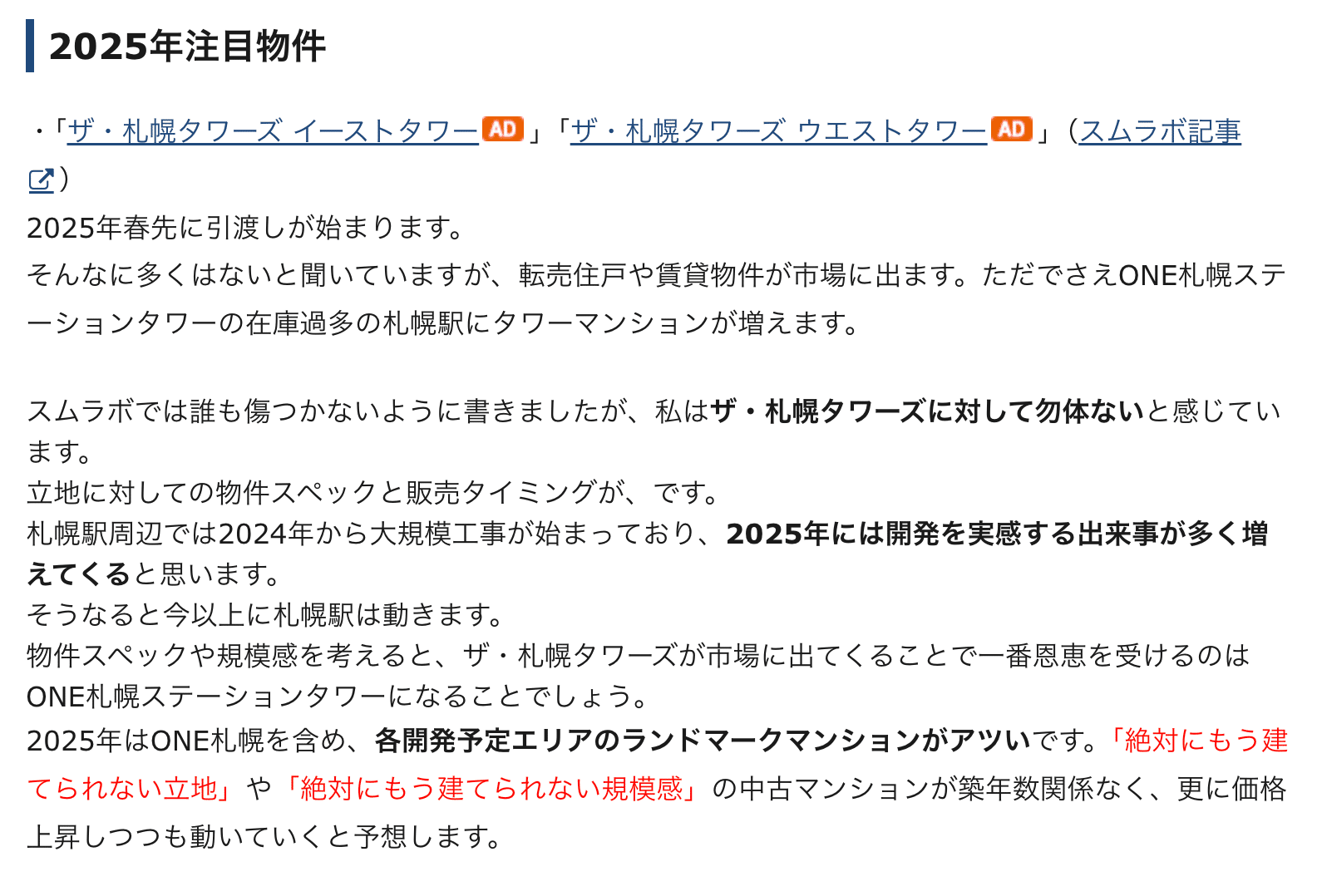 結果的には2024年のブログで書いた通り、ザ・札幌タワーズが市場に出てくることで他のマンションが恩恵を受けることになりました。