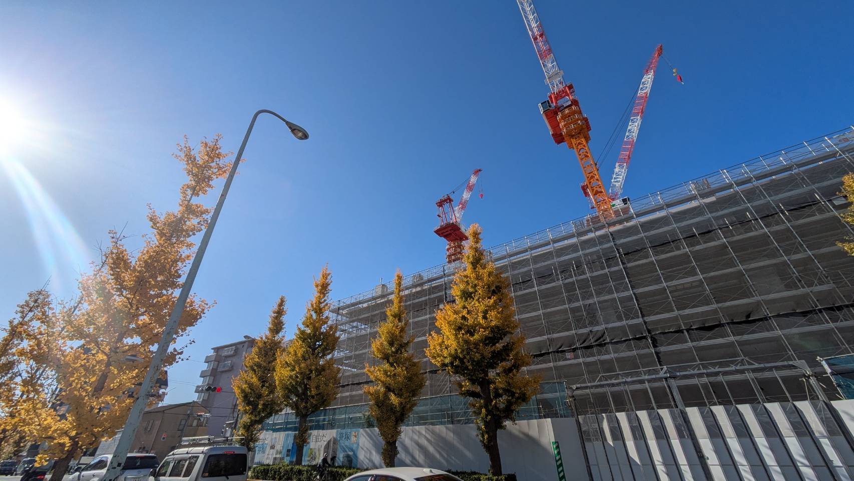 徐々にマンション建築も進み、その巨大さが感じられるようになってきました。高さもさることながら、横に広いマンションと言うことで存在感が際立つデザインになりそうです