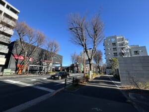 青梅街道に面する北側です。本件前は関町一丁目交差点の位置でもあり、四車線の道路は交通量が多いです。歩道は広く、歩きやすいです。青梅街道沿いは歩道が狭い箇所もあり、自転車が通ると怖いなと思う場所もありますが、本件前は歩道が広く、自転車とのすれ違いも余裕を持ってできます。