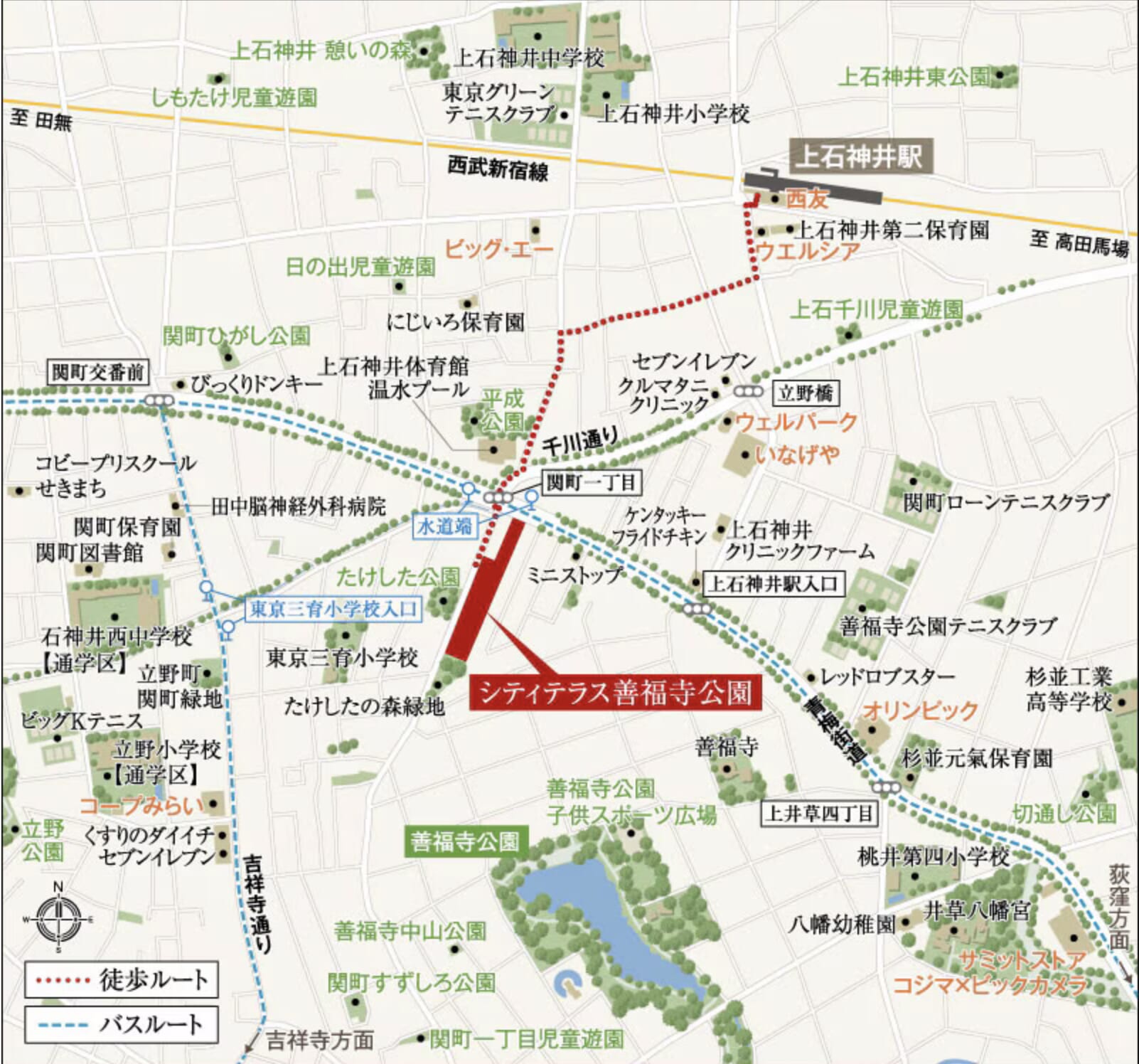 物件名に入っている地名は善福寺公園ですが、アドレスは「練馬区関町南」です。「関町南」というアドレスの地域は、青梅街道沿いを中心に東西に細長く、場所によってJRの三鷹・吉祥寺、西武新宿線の東伏見・武蔵関・上石神井とアクセスしやすい駅が異なります。新築マンションの供給がそれなりに多く、最近の物件では、「ブリリアシティ三鷹」、「パークホームズ吉祥寺北グランヴィラ」、「エステムコートグラン吉祥寺」など使われている地名が色々あります。