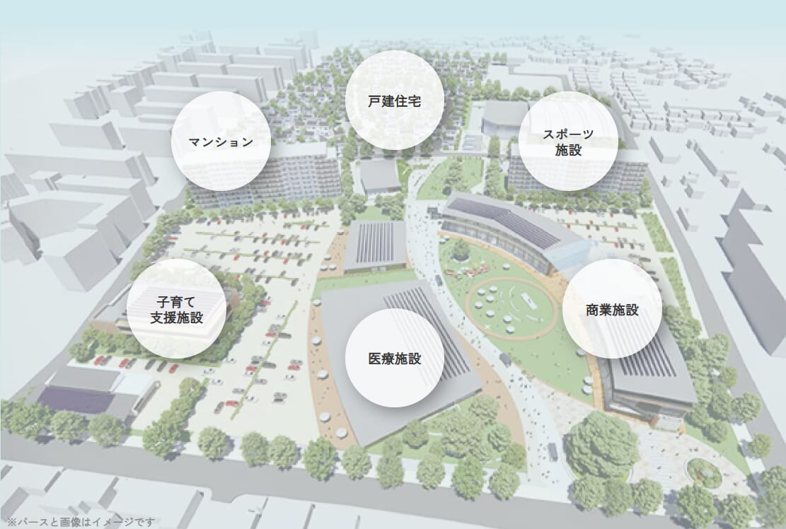 計画概要- 予定施設: 戸建住宅、分譲マンション、商業施設、医療施設、子育て支援施設、スポーツ施設ほか
