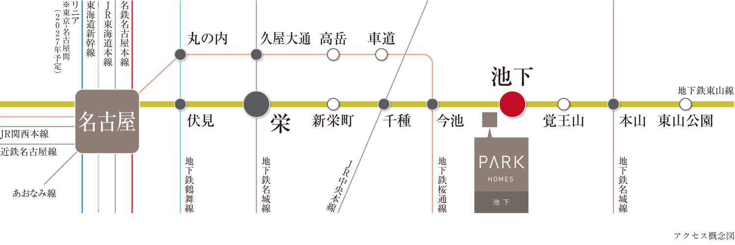 パークホームズ池下の最寄り駅は地下鉄東山線の池下駅で、1番出口より徒歩3分です。広小路通沿いの物件で目の前の道路の交通量は多いですが、建物を通りからセットバックさせてさらに全戸南向きで広小路通とは逆方向になるなどそのあたりはしっかりと考慮されています。池下というと駅前のグランドメゾンのツインタワーが最強の立地になりますが、本物件も徒歩3分ですのでアクセス面では十分といえるでしょう。なお池下駅から栄駅までは8分、名駅まで13分で、通勤シミュレーションは下記の通りです。