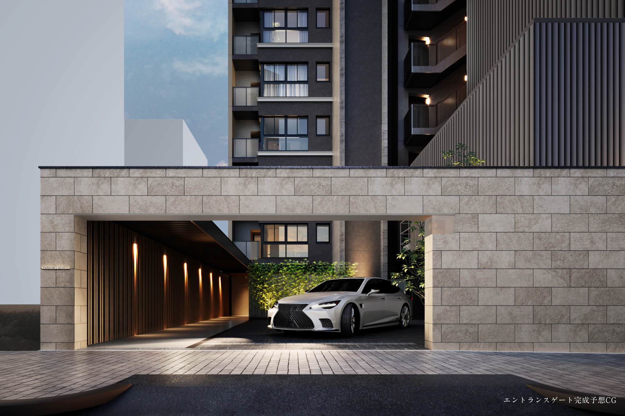 建物外観としてはよくあるデザインですが、個人的にはクラシックさを感じるデザインだなと感じました。なお実際には手間にエレベーターパーキングがありますので、このままの姿を近くで見ることは難しいです。特に注目すべきは建物そのものというよりはエントランス部分と言えるでしょう!