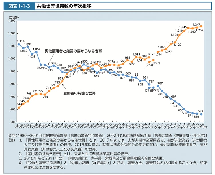 今や共働き世帯は全体の7割まで増加してきており、私への相談でも多くの方が共働きの方からの相談となっております。厚生労働省のデータを見ると1991年頃に共働き世帯が単身雇用世帯を逆転しており、今は以下グラフの通り共働き世帯が圧倒的に多い状況です。