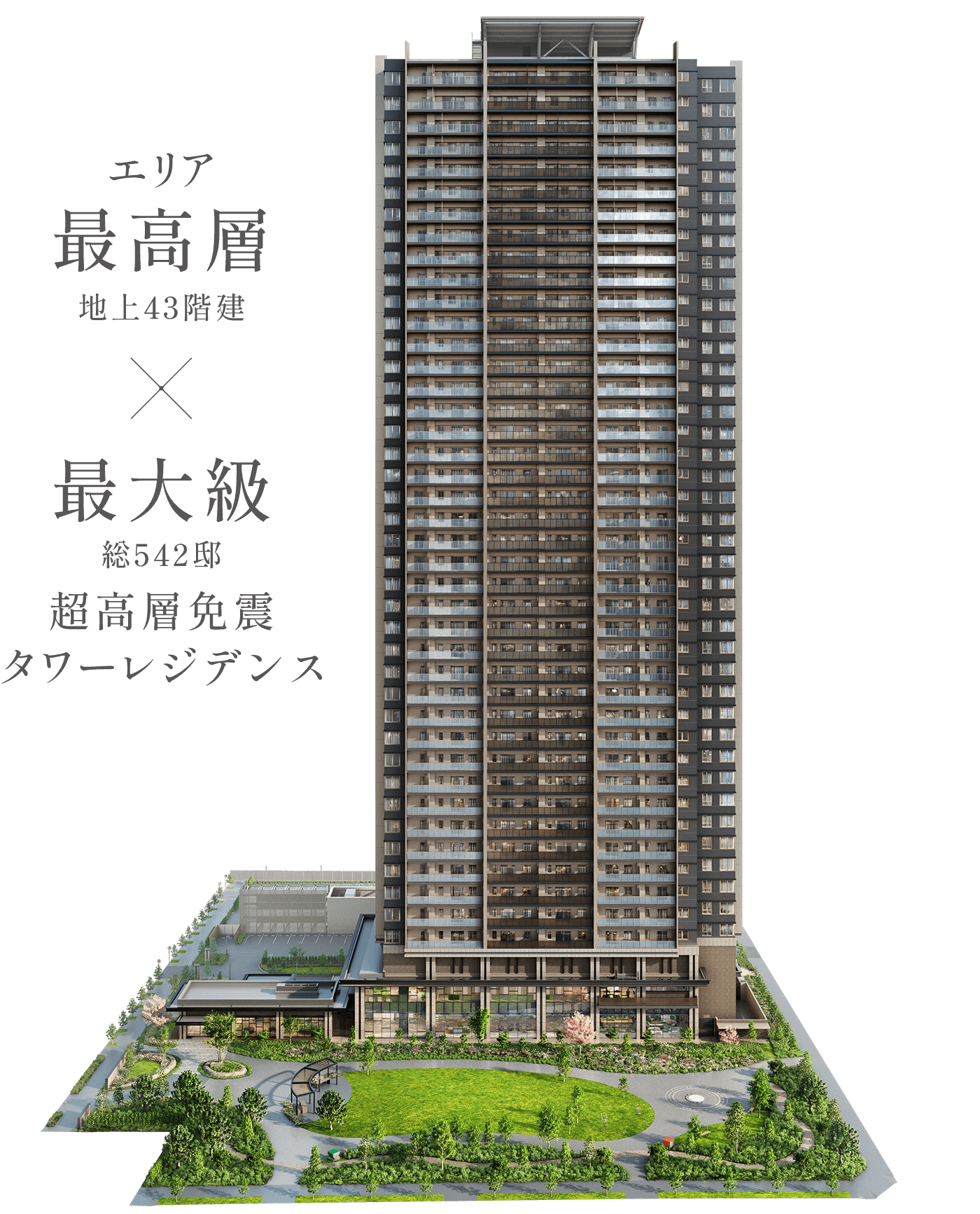 43階建て・542戸はエリア最大級で大阪市内のタワマンと比較してもかなり大きいタワマンとなります。