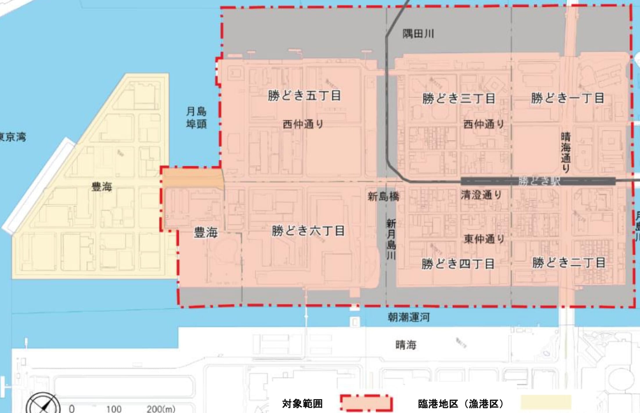 2016年「新しい都心ライフスタイルを育むまち 勝どき・豊海」として指定されたのが画像の対象範囲で、今やタワーマンションの建設や道路の整備が進み資産価値の高い街並みに変貌しています