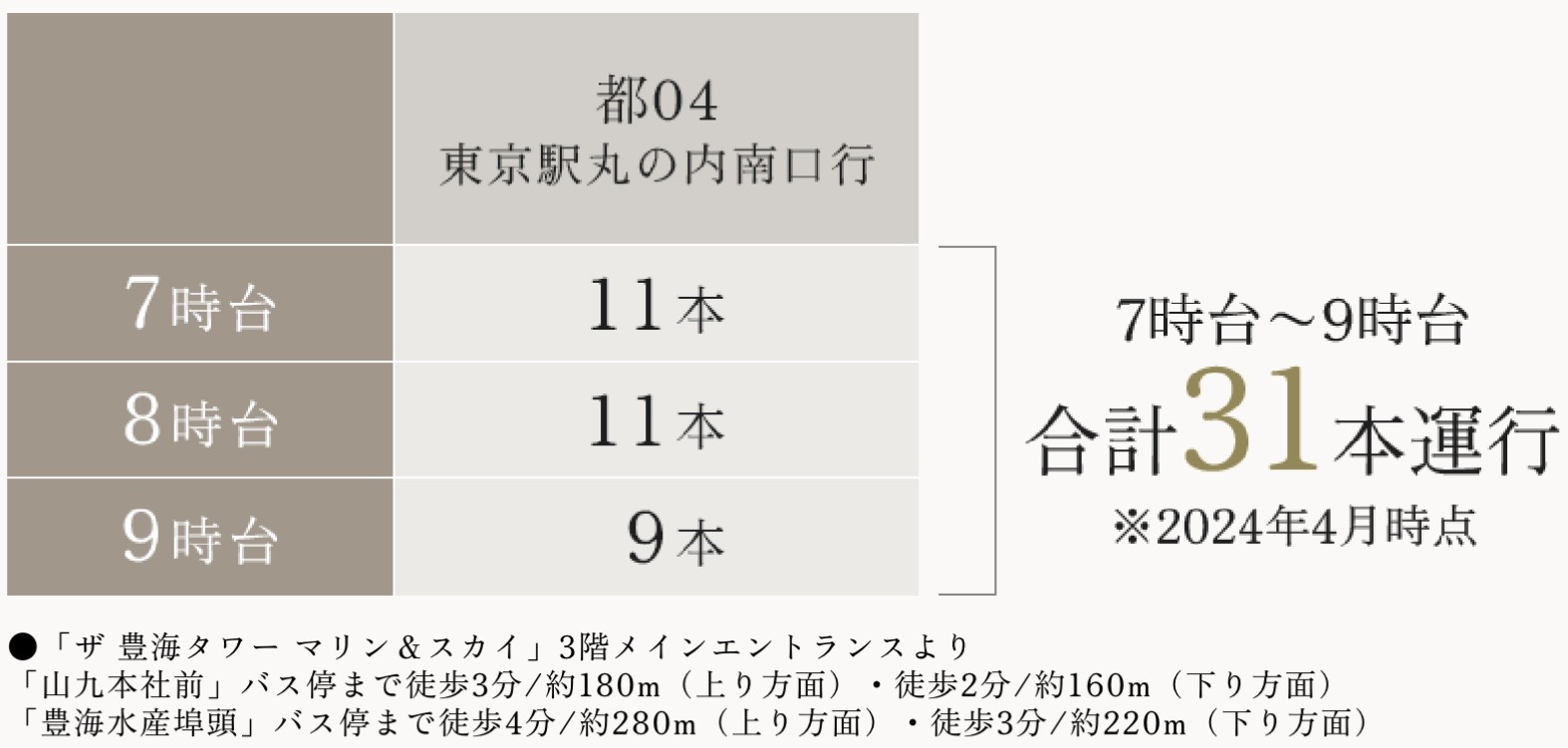 目の前の山九本社前バス停から、築地、銀座、有楽町を経由する東京駅丸の内南口行きの使い勝手が良さそうです