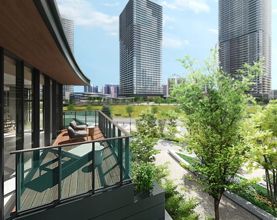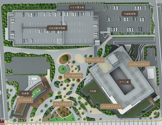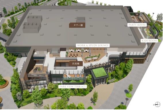 共用部分の大半は共用棟に設けられます。共用棟の2階には屋外に設置されたパークビューテラスがあり、パーティルームについてもテラス部分が設けられています。