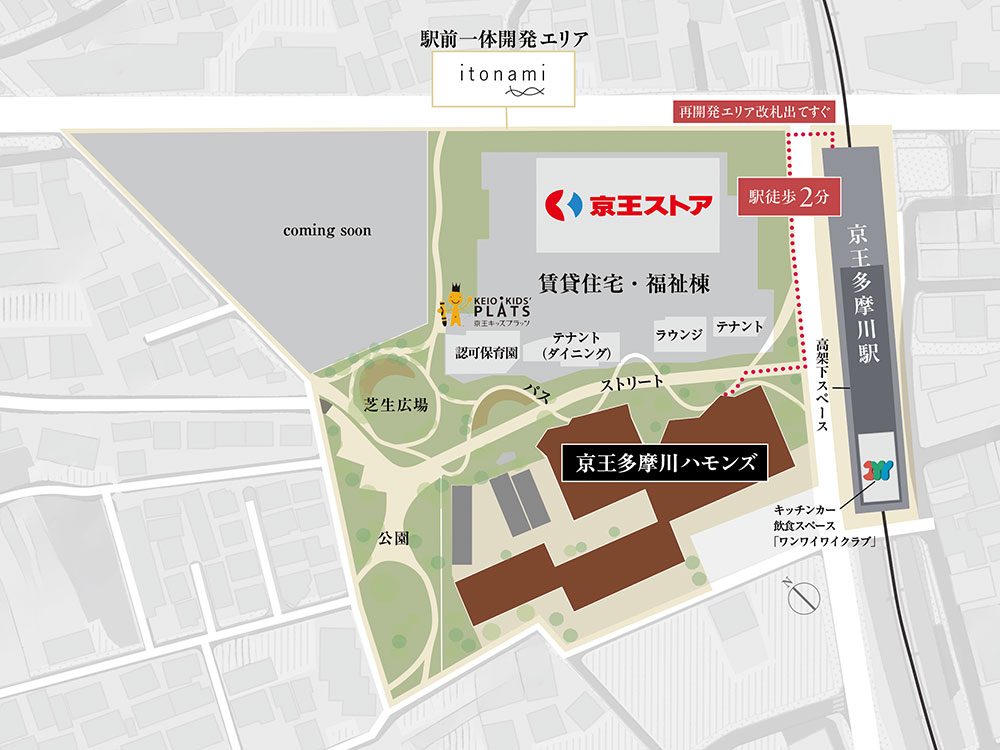 京王多摩川駅前は「京王多摩川駅周辺地区土地区画整理事業」による道路の新設・拡張と合わせた上で一体開発されます。本マンションと合わせ賃貸・福祉住宅棟が整備され、その1階には京王ストアや保育園、飲食店などが出店を予定しています。