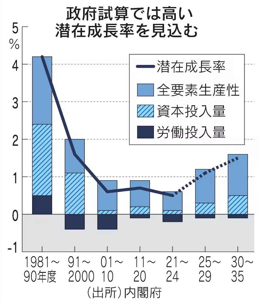 このシナリオは近年の日本の水準を上回る成長を前提にしている。経済の地力を示す潜在成長率が1.1〜1.5%程度に上がる「成長移行ケース」だ。近年は0%台半ば以下で推移していることを考えると、現実味が高いとはいえない。